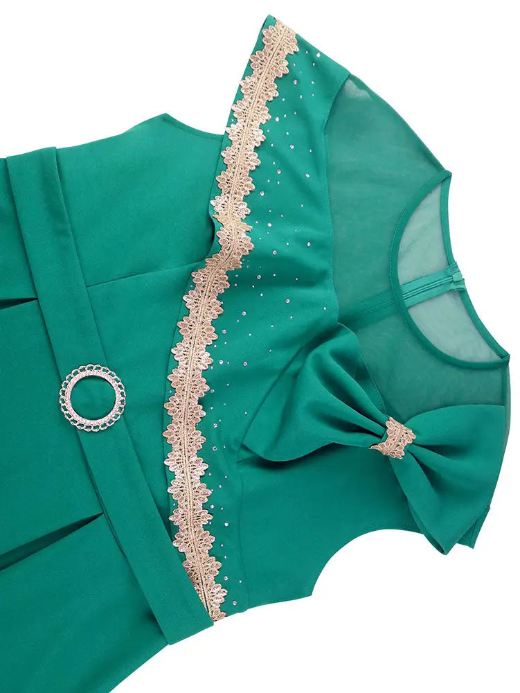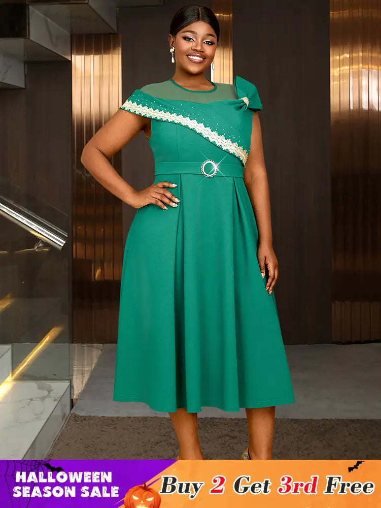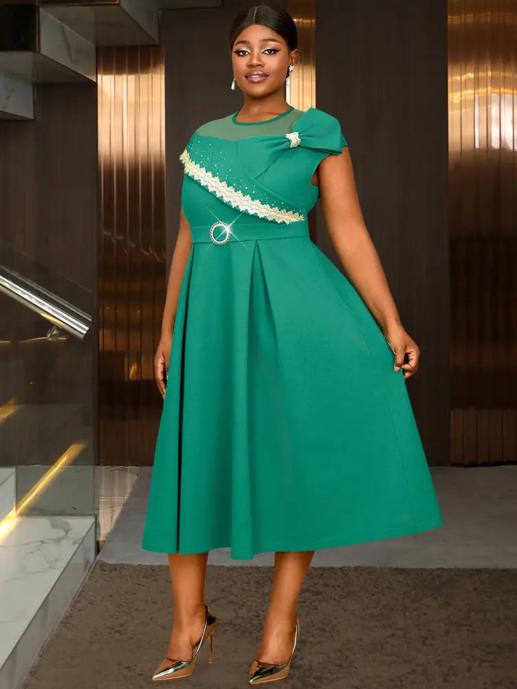 AOMEIDRESS Elegant A Line Dresses Mesh Patchwork Diamond Shiny Lace Bowtie Business Party Green / 0XL