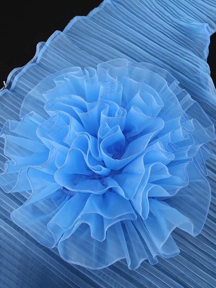 AOMEIDRESS Sheer Blue Mesh Top with 3D Floral Applique Wide Sleeves