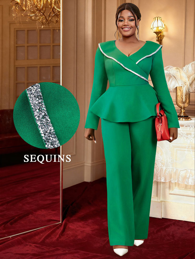 AOMEIDRESS Elegant Two Piece Set V Neck Peplum Tops Wide Leg Pants Green / S