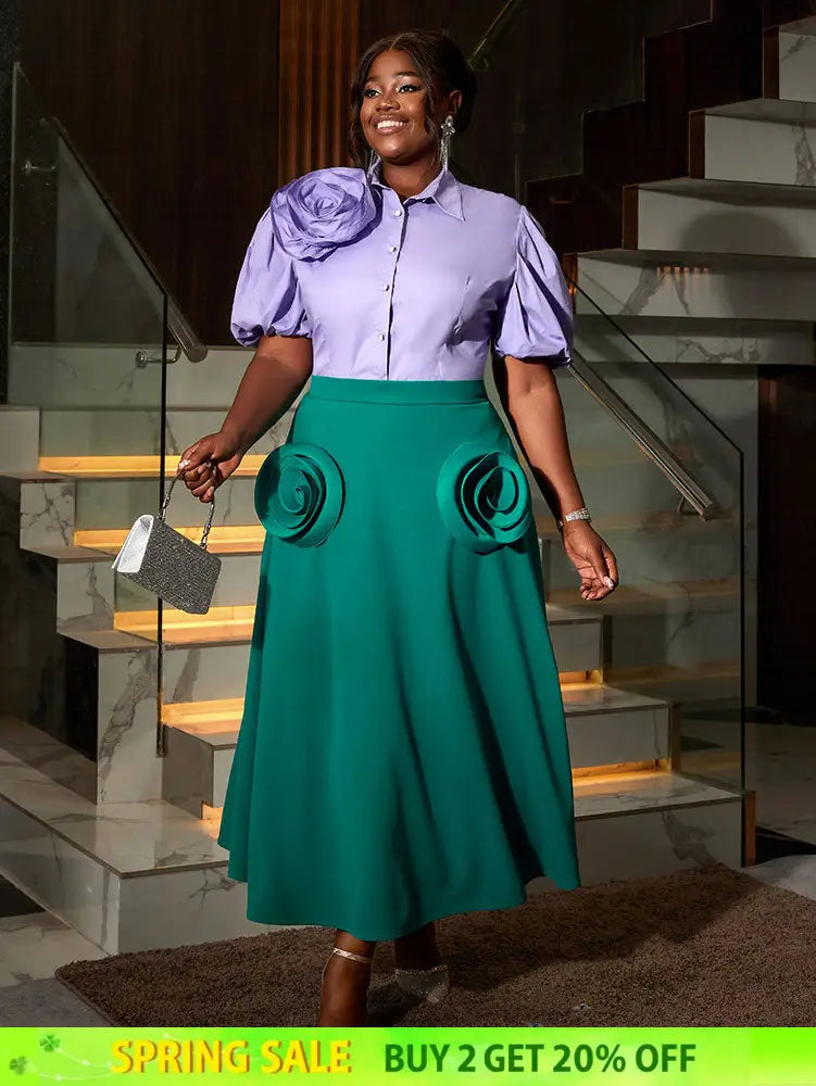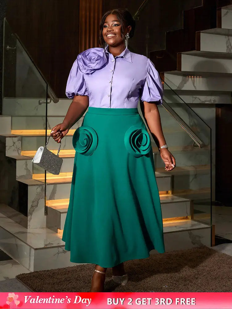 AOMEIDRESS Office Two Piece Set 3D Flower Shirt With A Line Skirt