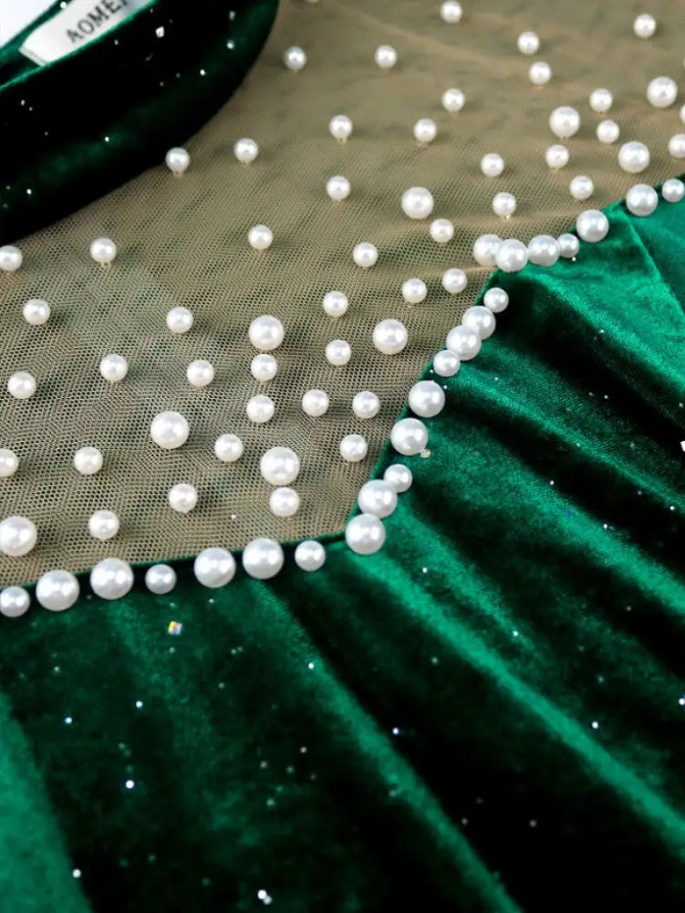 AOMEIDRESS Velvet Dress Mock Neck Mesh Patchwork Beading Long Sleeve Green / S
