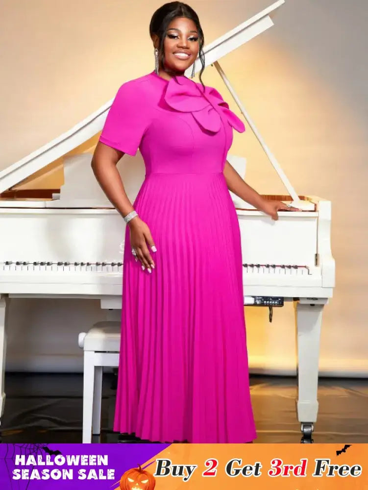 AOMEIDRESS Rose Casual Dresses O Neck Ankle Length Short Sleeves Pleated Big Bow - Rose / 1XL is backordered and will ship as soon as it is back in stock.