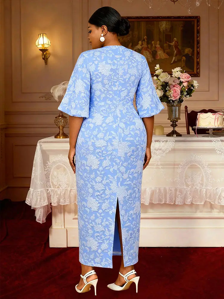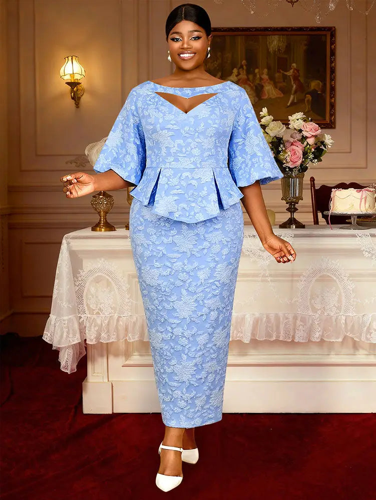 AOMEIDRESS Jacquard Bodycon Dress Cut Out Boat Neck Peplum Gowns - LightBlue / L is backordered and will ship as soon as it is back in stock.