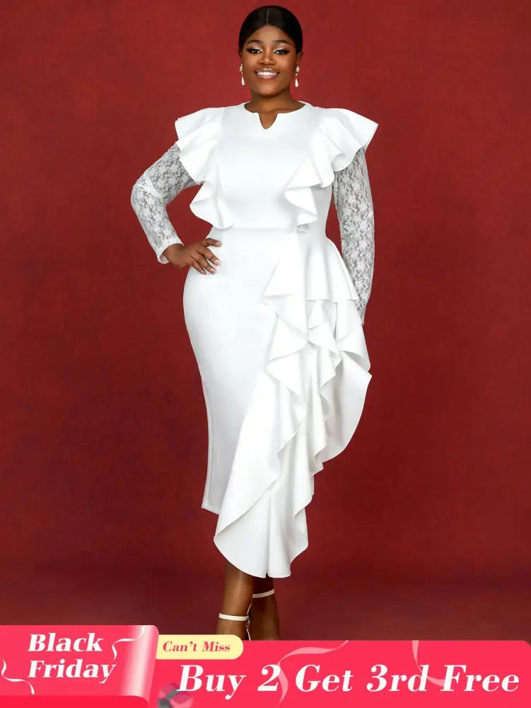 AOMEIDRESS Dress for Wedding Reception Long Sleeve Ruffle Trim Lace Knit Patchwork Gown