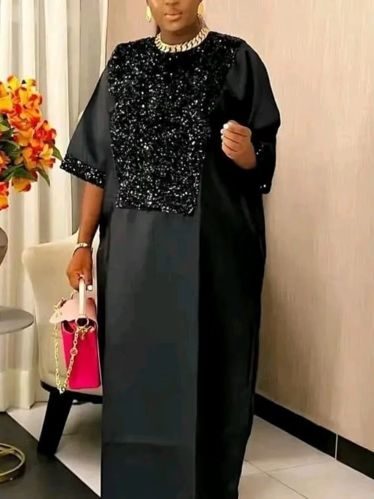 African Shiny Sequined Boubou Dresses Women Kaftan Church Clothing