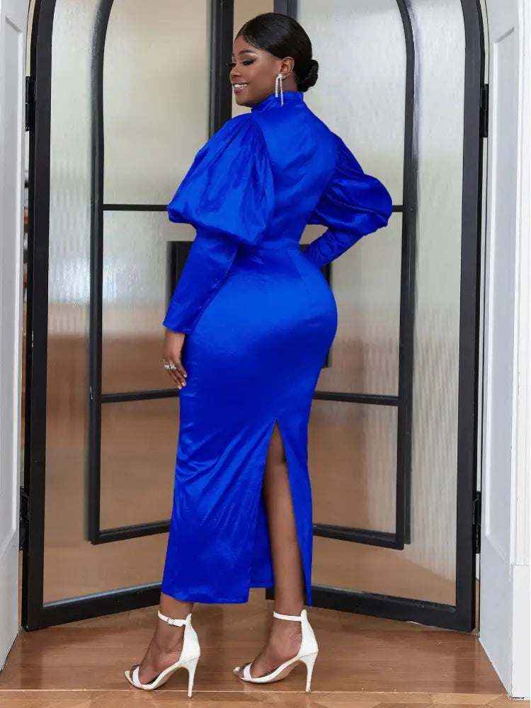 Details: Puffy Long Sleeve,Bright Sparkly,Pleats,High Slit