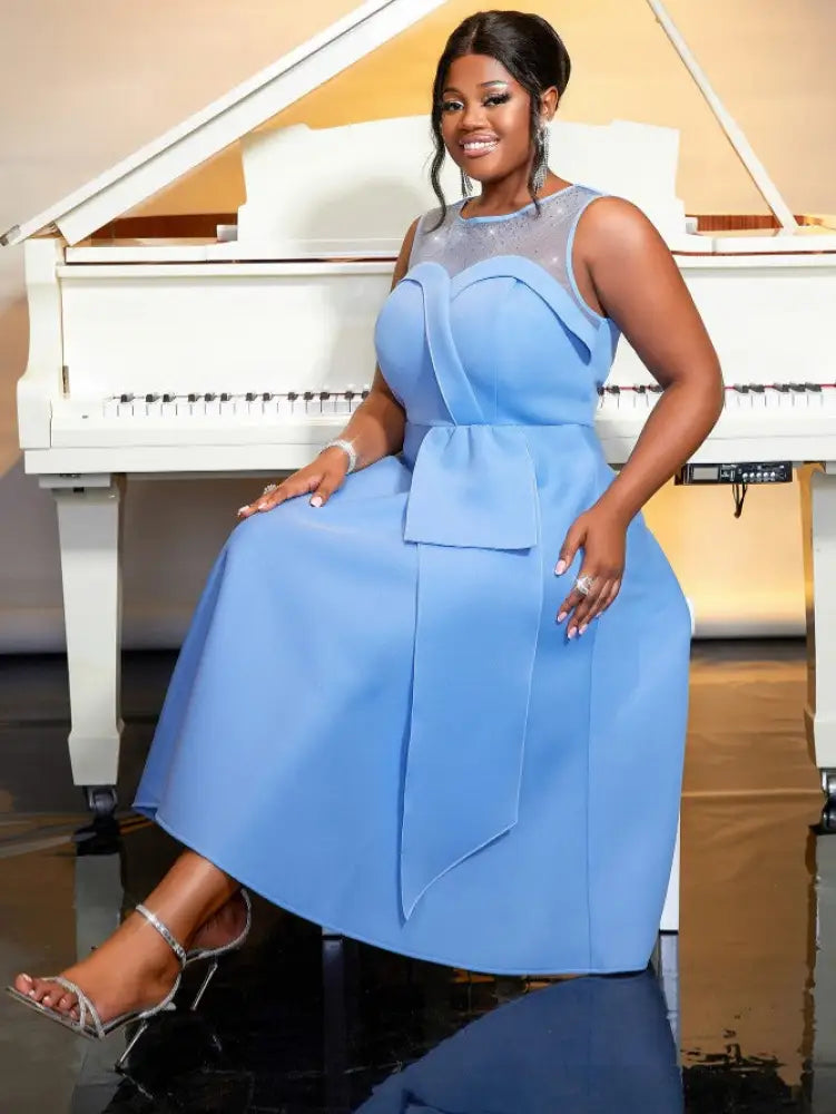 AOMEIDRESS Mesh Patchwork Hot Drill O Neck Sleevelss A-Line Dress