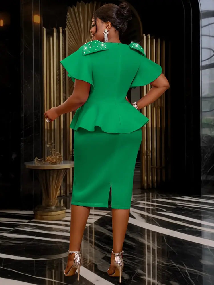 AOMEIDRESS Pink Sweet Dress O Neck Bows Beading Short Sleeves Ruffles Green / S
