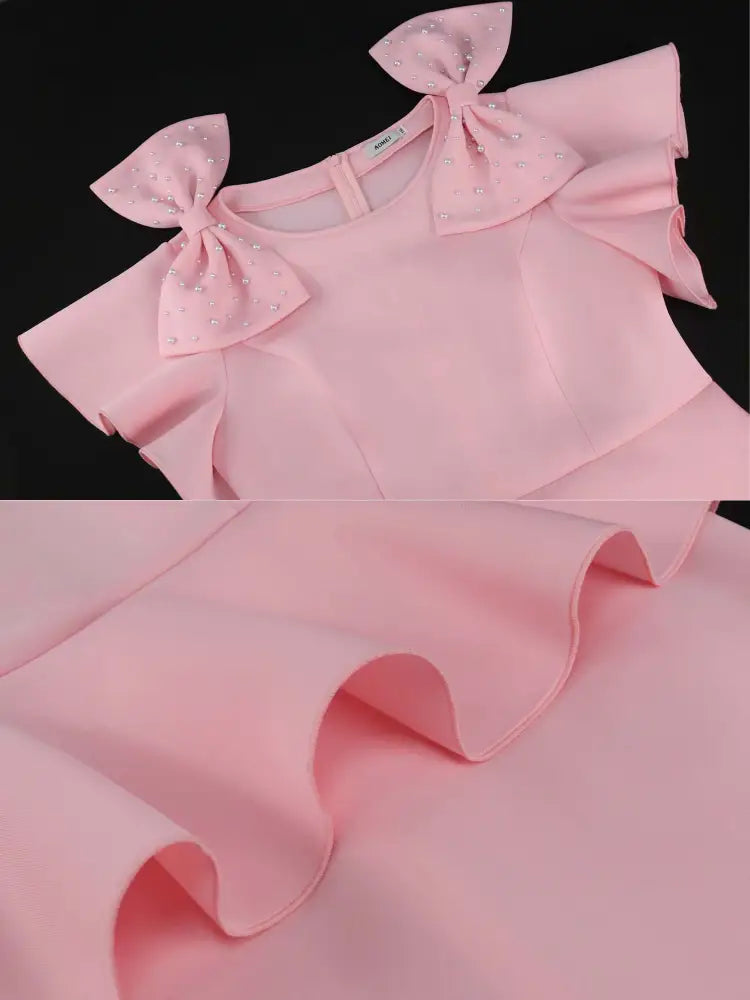 AOMEIDRESS Pink Sweet Dress O Neck Bows Beading Short Sleeves Ruffles