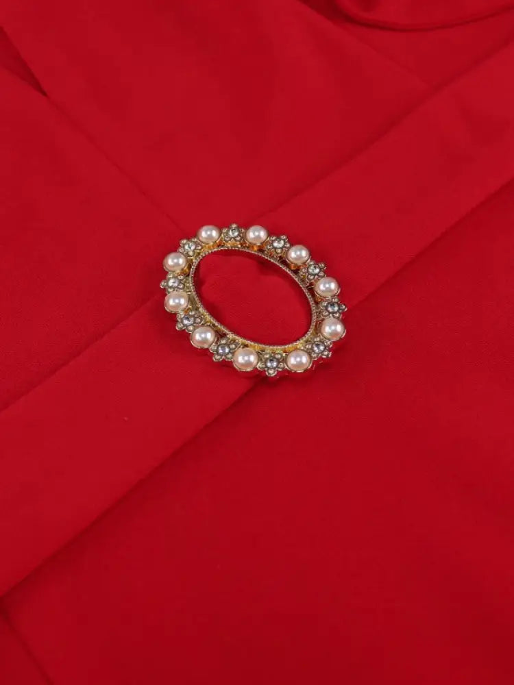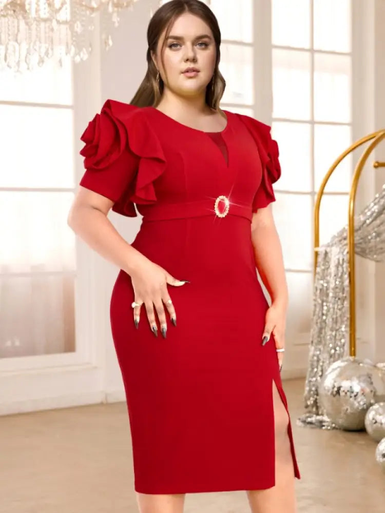 AOMEIDRESS Red Fashion Dress O Neck 3D Flower Short Sleeves with Belt