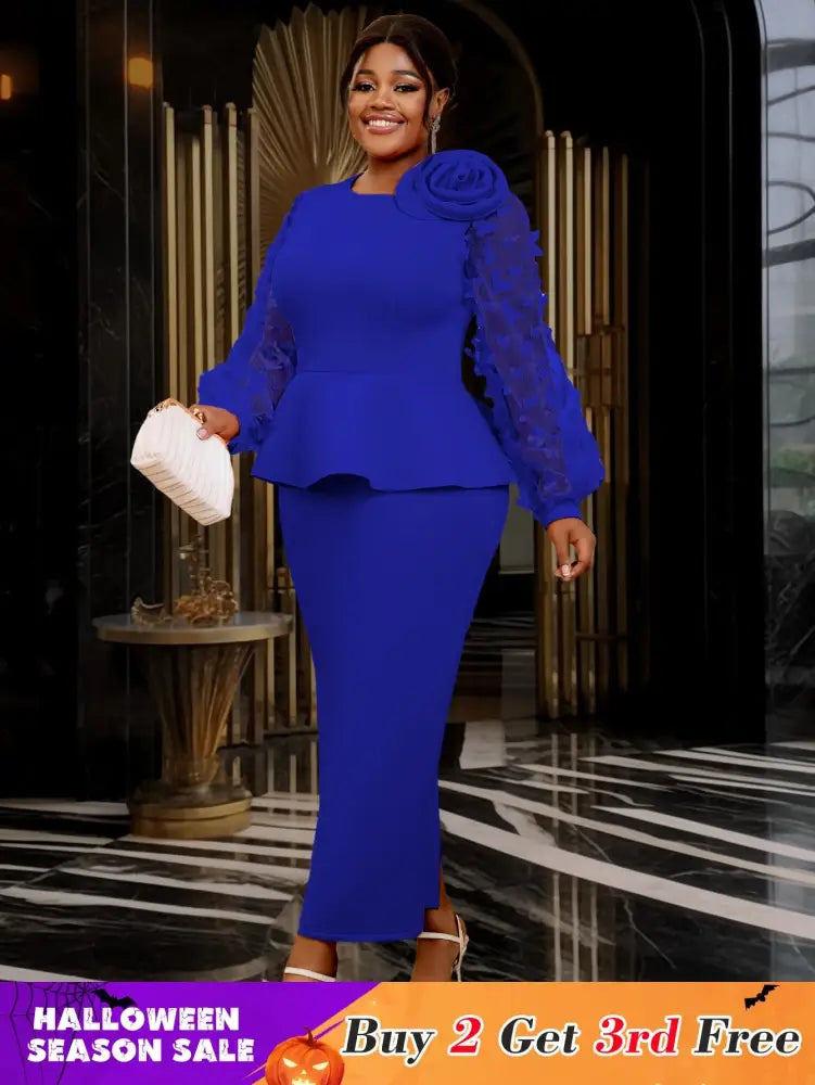 Blue Maxi Dress O Neck Sheer Lantern Sleeve with 3D Flower